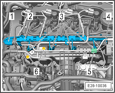 - Desenroscar los tornillos de fijación en el colector de admisión -6- y colocar la tubería de retorno de combustible a un lado.