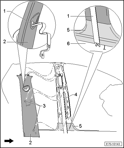 - Retirar el revestimiento superior del montante B de la banda del cinturón anterior -1-.